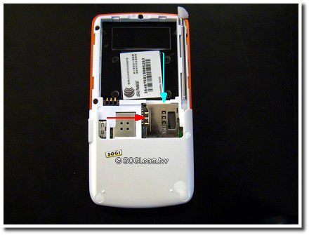 紅色的為 SIM 卡插卡處與方向,藍色的為記憶卡插卡處與方向;右側的為後蓋。