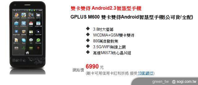 G-PLUS M600 是一款具備雙卡雙待功能的智慧型手機,採用 Android 2.3.5 作業系統,能夠 GSM、WCDMA 雙待,彈性選擇最佳的優惠費率合併使用,為自己省荷包。G-PLUS M600 使用 3.8 吋、800 x 480pixels 解析度電容式觸控螢幕,並搭載聯發科開發的 Media Tek MT6573, 650MHz 單核心處理器和 512MB RAM / ROM,提供基本的運算效能。