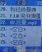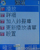上圖便是 HITACHI HTG-908 手機之 MP3 播放器設定全覽,普遍該有的播放器設定都有,可設定重複單曲播放、隨機播放、重複整個播放清單,此外,使用者還可以把喜歡的 MP3 音樂加入預設的五組空白鈴聲庫而設為來電鈴聲。