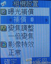 HITACHI HTG-908 的相機設定非常齊全,舉凡曝光補償、數位變焦、自拍連拍,還有上一段所列出的數款拍攝效果模式,應有盡有。此外,HITACHI HTG-908 還擁有延遲拍攝的功能,顧名思義,就是一般數位相機所擁有的定時自拍,只不過手機內建的此功能無法自行設定「時間」罷了!