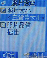 在照片大小的設定上,HITACHI HTG-908 具有三種尺寸大小的選擇,分別是主螢幕大小、320 x 240 與 640 x 480。此外,使用者亦可選擇想要的照片品質,當然還是以設定極佳狀態為最首選。