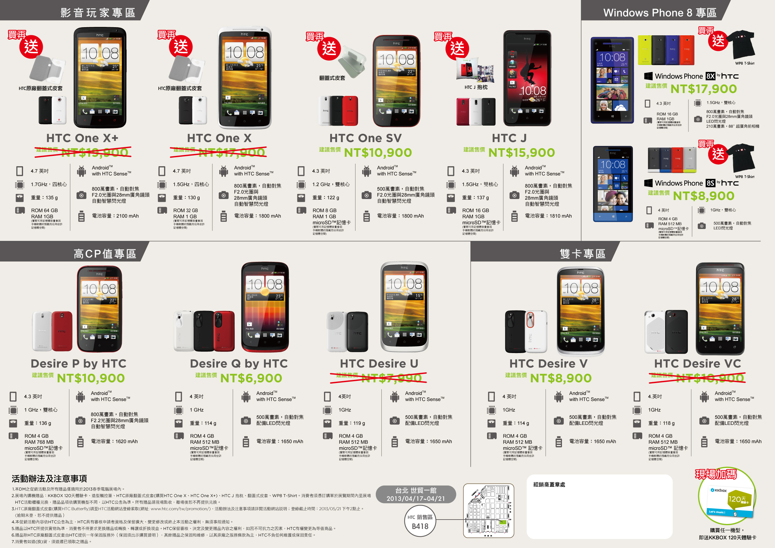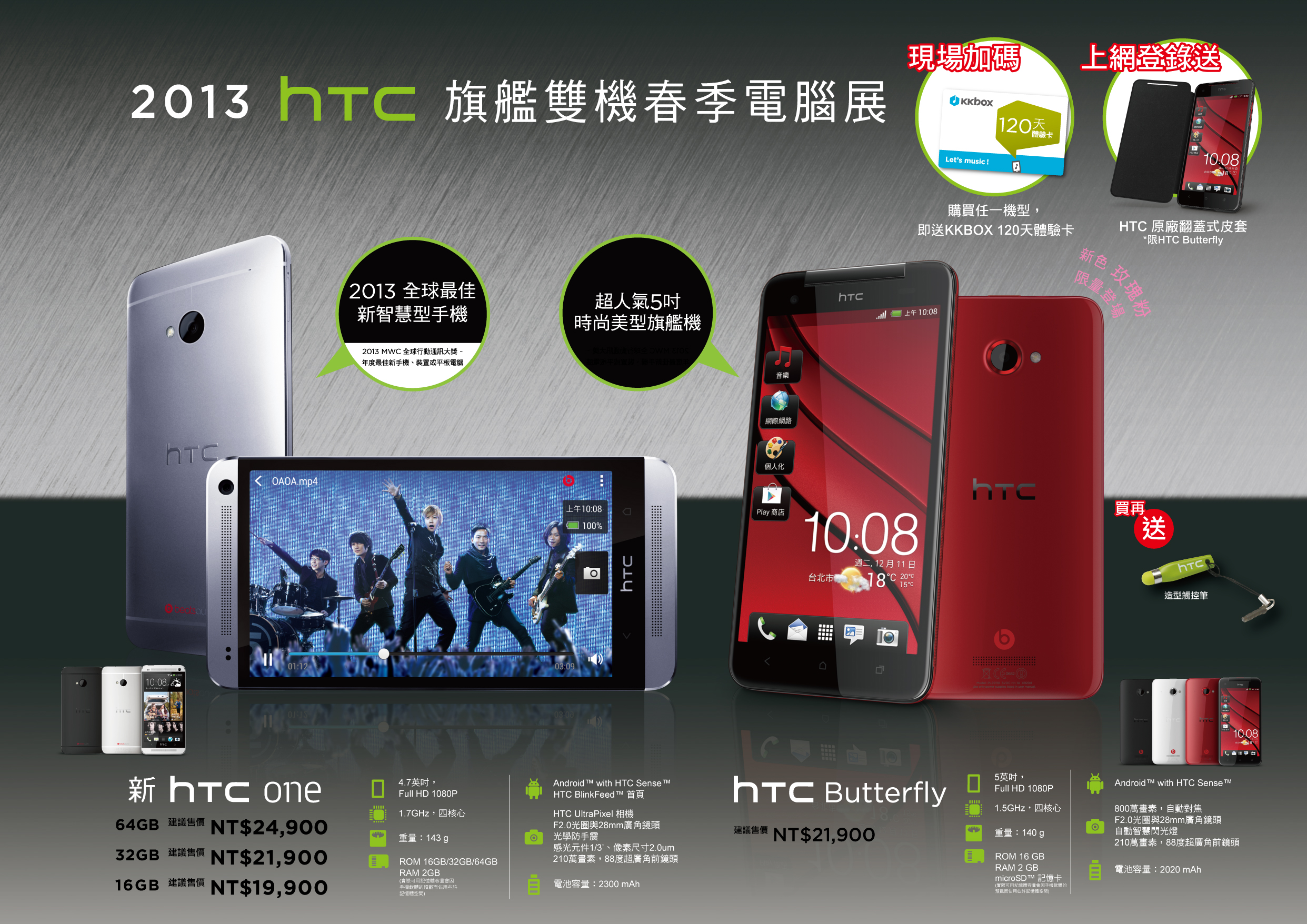 ▲2013 春電展期間,凡購買 Butterfly 蝴蝶機即贈送造型觸控筆、上網登錄加贈原廠翻蓋式皮套。此外,於 2013 春電展內購買任一 HTC 智慧型手機,可獲得 KKBOX 120 天體驗卡,部份機種還有展場優惠價格。