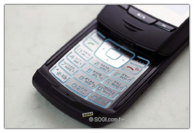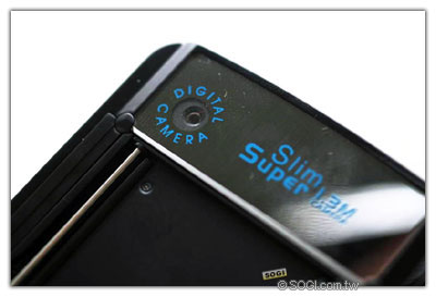 內建 130 萬 CMOS 相機於上蓋,在厚度不到 8mm 的上蓋放置一個鏡頭其實也算是滿厲害的,可惜沒能再加一個補光燈,就會更完美了,畢竟現在的照相手機搭配補光燈都是很基本的事情。而滑蓋手機的優點之一便是能夠保護相機鏡頭。