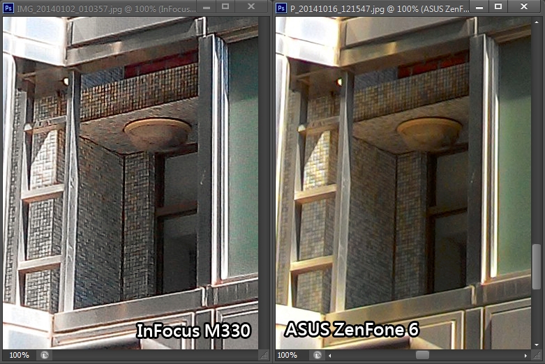 ▲InFocus M330(左)、ASUS ZenFone 6(右)日間拍攝畫面 100% 裁切。