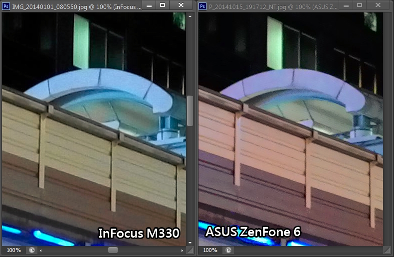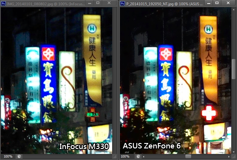 ▲InFocus M330(左)、ASUS ZenFone 6(右)夜間拍攝畫面 100% 裁切。