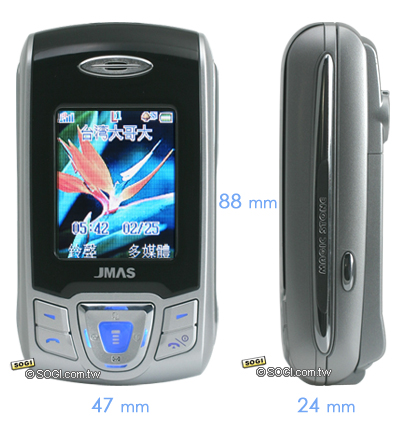 JMAS 「與你就麻吉」,推出了第一款滑蓋手機 S320,造型出眾,黑銀雙色的搭配,秀出一股不凡的品味。此外,S320 為半自動滑蓋設計,手指輕輕一推,上蓋便會自動到位,手感相當好,非常具科技時尚感。