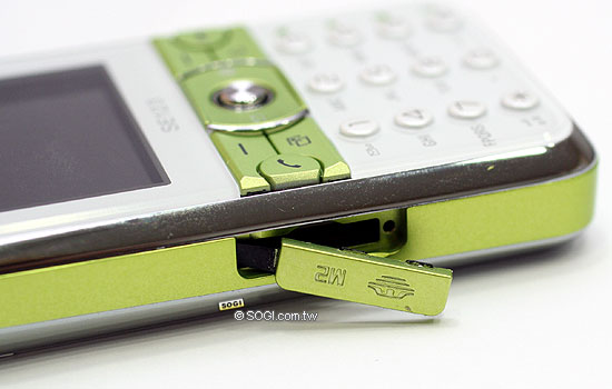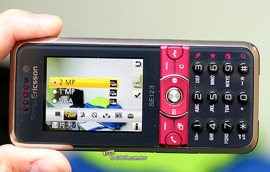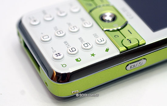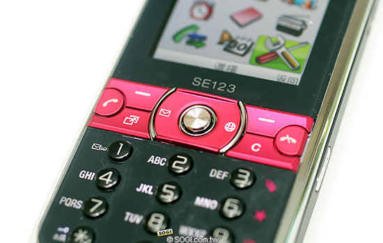 中央導航鍵的部份,白色款以草綠色搭配、黑色款則配上甜蜜的桃紅色,明顯感受 K660i 以年輕族群為訴求。導航鍵按右快捷進入網路功能,是 K660i 的上網快捷鍵。而手機中間的 SE123 LOGO,則是 Sony Ericsson 內部測試機的代稱,明年 2 月上市後會改為 K660i,也請網友不要誤會。另外,數字鍵 3、6、9、# 對應的上網快捷鍵,為編輯、我的最愛、網頁縮放等功能。
