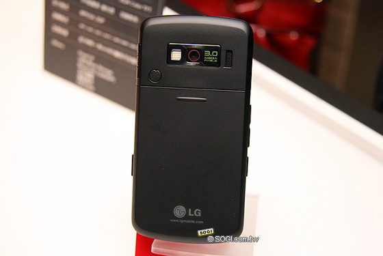 LG KF600 背面為 320 萬畫素自動對焦相機,鏡頭旁邊並附一 LED 閃光燈與揚聲器喇叭。