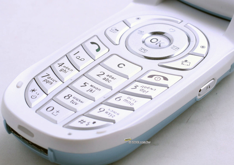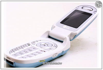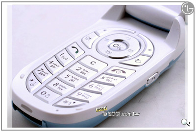 翻開螢幕,銀白色的底座映入眼簾,打造整體春天的季節感。數字按鍵的排列與以往 LG 傳統貝殼機的設計如初一轍,並無特別之處,但也承襲了 LG 一向操作感很舒適的大按鍵。