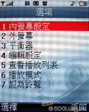 在機身側邊設計上,LG G262 具有非常齊全的快捷鍵設計,使用者可以按下機身側邊相機快捷鍵直接啟動外螢幕自拍,另外,按下上掀蓋的 MP3 操作介面 Play 鍵之後,外螢幕就會跑出如下圖所示的幾款功能選單,要挑選其他功能,只要按下機身另一邊的音量調整鍵再按一次 Play 確定即可。