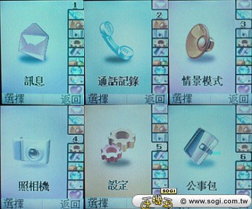 功能表的項目共有『訊息』、『通話記錄』、『情景模式』、『照相機』、『設定』、『公事包』、『娛樂與工具』、『行動網』、『JAVA』、『收藏夾』、『加值服務』
