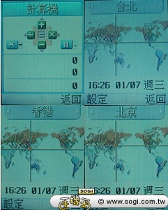 值得一提的是,在娛樂工具的功能裡有一項時區設置;每一國家的首都時間都準確地在裡頭,台北旁邊就是中國大陸的北京、再向左就是香港;只可惜這隻手機並不是三頻機、不能漫遊無國界,所以雖然有此項貼心功能、但似乎也派不上用場。