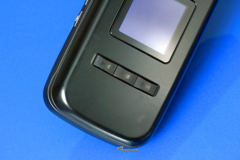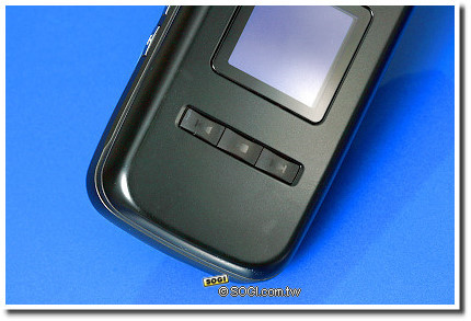 位於外螢幕正下方,是常見的 MP3 音樂外置鍵,透過按鍵的設計,可達到單手操作的目的,讓使用者不需開蓋就能夠調整音樂播放及前後首歌曲。再搭配外螢幕的曲目顯示,則更能夠符合人性化的訴求。