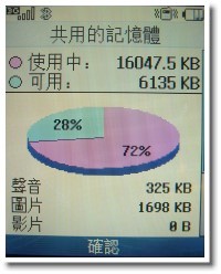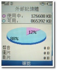 現在市售的中高階手機,幾乎都內建了外接記憶卡功能,LG KU311 也不例外。所使用的規格是目前相當普遍的 microSD 記憶卡,進入手機的「記憶體狀態」中,便可觀看記憶體的使用情形,KU311 還細心地將各個記憶體類別劃分清楚。