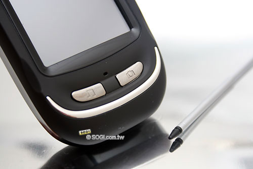 PHS PG2000 內建有觸控筆,支援智慧型手寫辨識功能;26 萬色超大 QVGA 觸控螢幕,觸控螢幕的辨識度相當不錯,但反應速度差強人意。掀開外蓋可以清楚看到該款 PG2000 正面唯二設置的兩顆快捷按鍵,左邊是 MP3 音樂、而右邊則是相機快捷鍵。