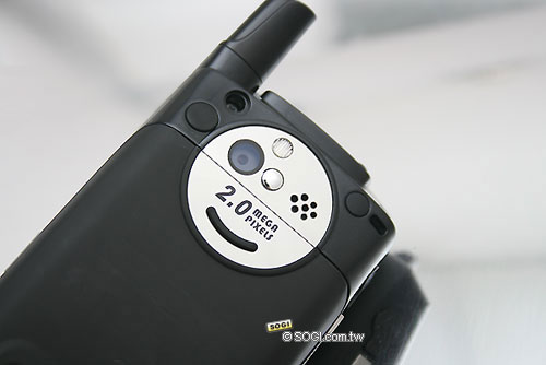 手機背面就是 200 萬畫素相機鏡頭,屬於鑲嵌內建在機身裡頭,可以不用擔心鏡頭損傷的問題,鏡頭旁邊有一顆自拍鏡和揚聲孔,上頭則是有一個補光燈。為了方便玩家更換電池,在「2.0 MEGA PIXELS」字樣的下方,特別設計了微凸的推條,以利單指推開背蓋。