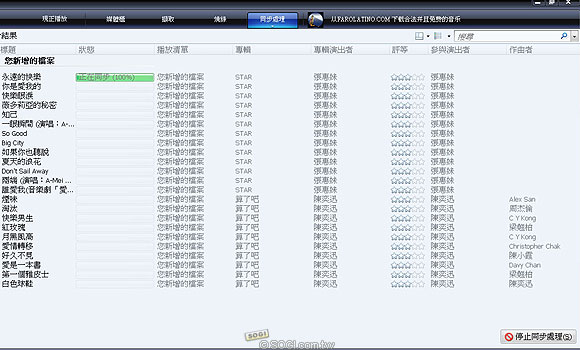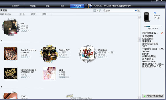 RAZR V8 與電腦傳輸十分簡單,在手機透過 USB 傳輸線與電腦連接之後,手機端選擇多媒體同步,而電腦上的 Windows Media Player 的右側會顯示 V8 與電腦連線成功,此時將音樂拖曳至右邊,然後同步音樂就可以。如果是左邊有編輯封面的音樂,同步到手機當中就會顯示這些圖片。同時,Windows Media Player 右側會顯示可用的容量,V8 內建 512MB 的大容量動態記憶體,可全當作儲存音樂之用。而 V8 也支援 USB 2.0 的高速傳輸協定,傳輸一首歌曲僅需 2-3 秒。