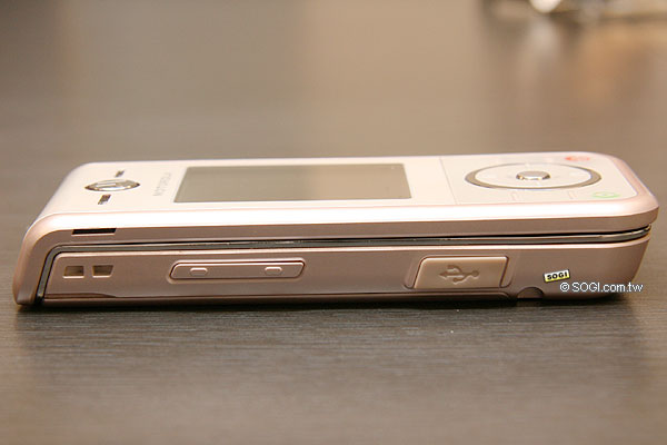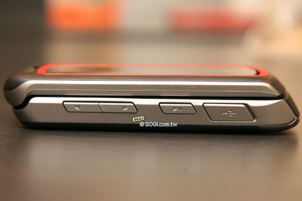 ▲ 在機身的左側由左至右分別為選曲鍵(於通話中可當音量鍵)、音樂播放鍵、 USB 插孔。