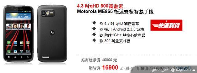 頂著老大哥 MOTO ATRIX 獲獎無數的光環,MOTO ME865(國外名為 MOTO ATRIX 2)在台推出時雖被更高階的 MOTO RAZR XT910 掩其鋒芒,但依然不失其優異規格的本質。身為接班人,MOTO ME865 不但採用更大更清晰的 4.3 吋螢幕,也將相機規格推進至主流 800 萬像素等級,同時支援 1080P Full HD 錄影與 HDMI 輸出,並改用德州儀器出品的 TI OMAP 4430, 1GHz 雙核心處理器,比起前一代加強不少影音效能!更加適合上網與觀賞影片。