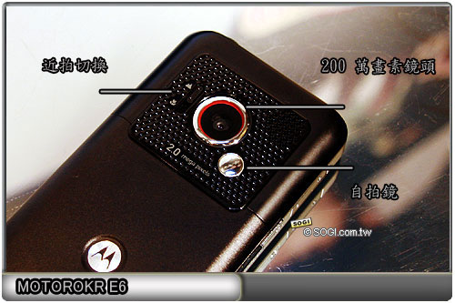 MOTOROKR E6 配備 200 萬高畫質攝錄功能、多種格式音樂播放、3.5mm 立體聲耳機插孔、FM Radio、A2DP 立體聲藍牙耳機、專用音樂快捷鍵以及可擴充 SD 記憶卡插槽等,為音樂手機立下良好典範。
