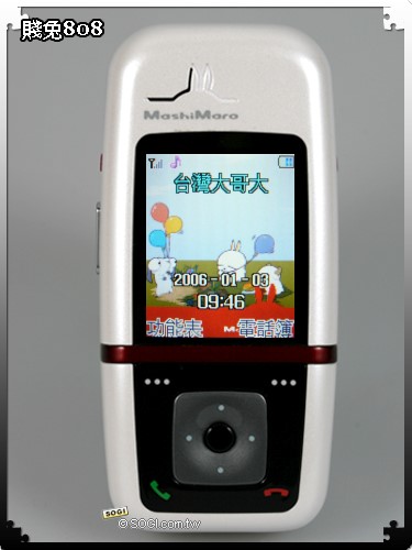 超可愛的韓國賤兔又來囉!由朔碁科技代理的 MashiMaro 賤兔機,又有新產品遠赴重洋來到台灣,讓喜愛賤兔賊賊模樣的大朋友、小朋友,能夠再次目睹卡通偶像的迷人風采。這隻在 1999 年出生的兔子,有著圓嘟嘟的身材、迷濛到幾乎快要睡著的雙眼,討喜的外型和神情,讓它的週邊產品因此而大受歡迎。而這款最新的 M808 賤兔機為了迎合粉絲的收藏心態,在推出手機的同時,除了由「橙果設計」一手打造手機外型,更替 M808 賤兔機設計了一系列的專屬配備,像是賤兔手機套、吊飾、充電器、精美購物帶和側背包等,能夠將喜愛賤兔的粉絲一網打盡。M808 單機建議售價為 9,900 元。