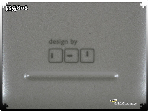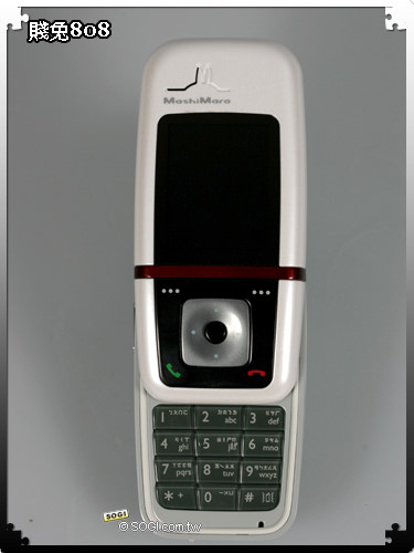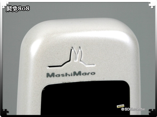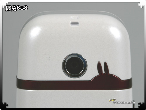 由「橙果設計」一手打造的 MashiMaro M808 賤兔機,以賤兔耳朵的線條作為主要軸線,讓機身隨處都可看見兔子的蹤影,例如:滑蓋螢幕上方、背面鏡頭下方等,另外,「橙果設計」還在電池背蓋上加了自家的專屬 Logo,讓手機渾身上下都充滿了特殊的設計元素。