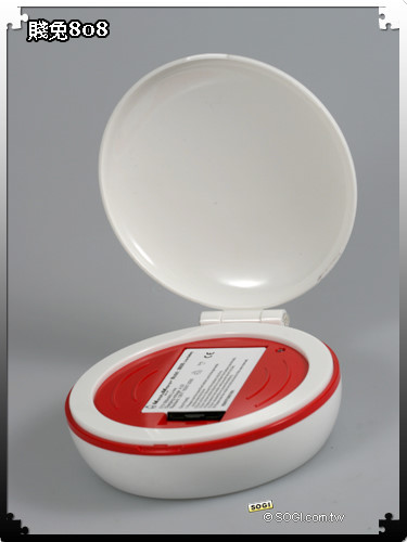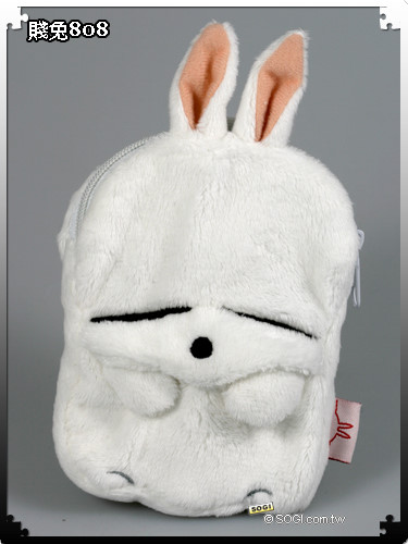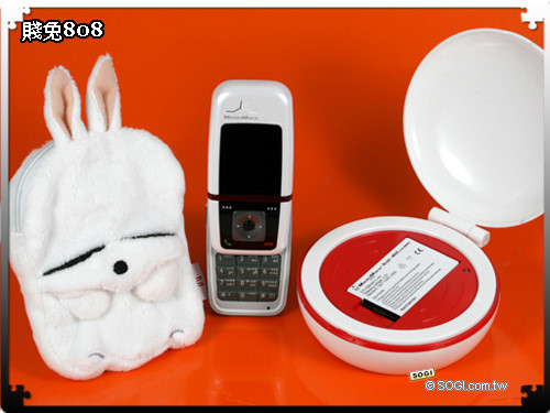 超可愛的配件很難讓人不心動!位於 M808 賤兔機左側的是擁有賤兔造型的手機套,具備拉鍊機制,如果不用來裝手機的話,還能夠當作零錢包使用;至於右側則是 M808 賤兔機的專屬充電器,造型相當犀利,而充電器白色的外殼能夠與賤兔相呼應。