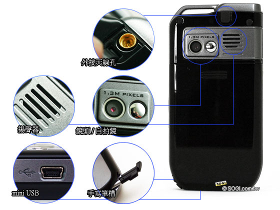 接下來我們看到背面的設計,130 萬畫素鏡頭、自拍鏡、揚聲器等等,都是手機常見的介面,而其中最主要要介紹的還是在機身上頭有個外接天線的孔,使用者可以自行購買對應的天線來加強其 GPS 衛星強度,而當然只是在多種摭蔽物影響到收訊才需要用到,一般時候使用 SirF Ⅲ 晶片的 Mio A700 是不需要的。