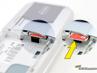 Mitsubishi M790i 的 SIM 卡是在背面插入式,只要將 SIM 卡放到卡槽中再按一下就可以輕鬆的置入。而下圖則是它側面的相機功能鍵,以及耳機孔,只要利用這些功能鍵就可以使用超大外螢幕來進行拍照,也可以在外螢幕操作所有的照相模式以及其他設定,相當的方便。