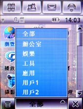 和 Motorola E680 一樣,E680i 的螢幕為 65536 色的 TFT 螢幕 、螢幕尺寸達到 2.5 吋、解析度為 QVGA ( 240x320 pixels )。由於是以 A780 為基礎的一款手機,因此小編認為內部的功能和 A780 都差不多,在功能表選單都可以自己的需求,來分類為辦公室、娛樂 、工具 、應用等等,而且使用者也可以自訂分類,相當的人性化。