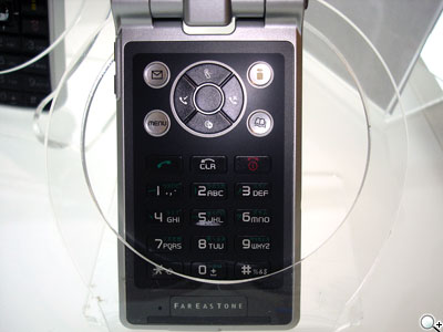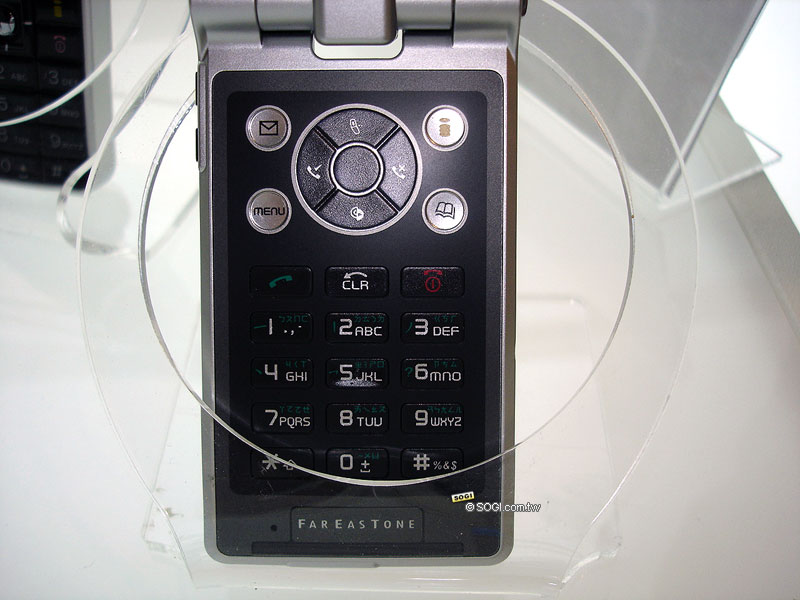 在鍵盤的右上方有專為i-mode所設計的快速鍵,這已經成為所有的i-mode手機的基本快速鍵之一,使用者不用再點進選單裡才能使用i-mode,鍵盤下則有遠傳的英文LOGO「FAREASTONE」。