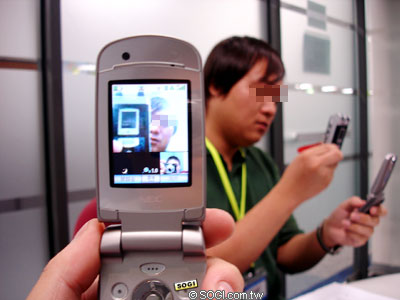 小編在現場不僅以兩支 NEC N600i 進行視訊電話,還以水貨商炒的沸沸揚揚的 Sony Ericsson 802SE 來和 N600i 進行視訊通話。小編將遠傳的 USIM 卡插入 802SE 以後,在 30 秒以內找到了網路訊號並切換成 3G 網路。小編總共試了三次才成功通話,第一次是 802SE 當機,第二次則是像圖中可看到,802SE 的一方接聽了視訊電話以後看不到影像,直到了第三次才成功。