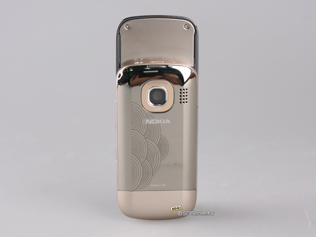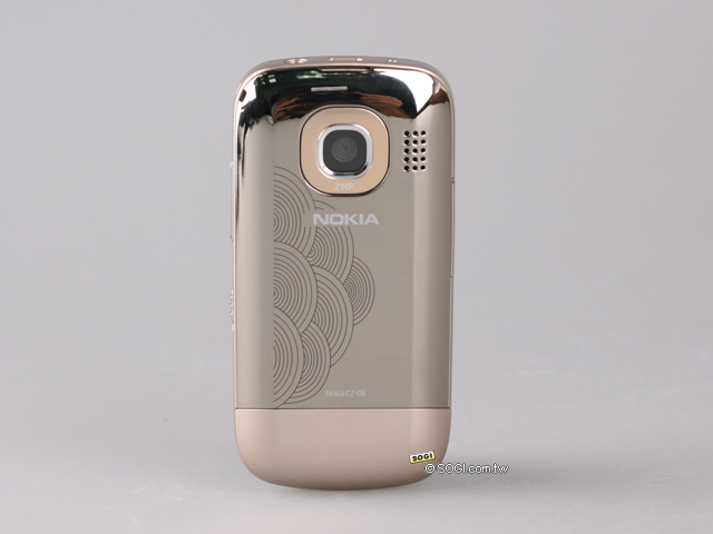 ▲NOKIA C2-06 搭載入門等級的 200 萬畫素鏡頭嵌在機背上方,沒有自拍鏡與補光燈設計,鏡頭外圍則多加了一圈香檳金外框點綴。
