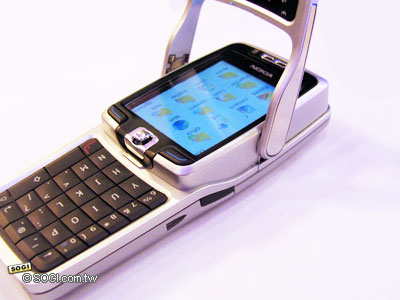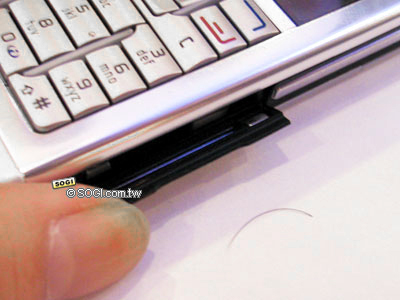 不過可千萬不要以為在這簡單的外型下,就以為 Nokia E60 沒什麼特殊功能了。從上圖手機側邊上可以發現,Nokia E60 具備了 PoC 即按即說功能,另外,它還支援了 VoIP 網路電話與 WCDMA 技術。除此之外,Nokia E60 還是一款可支援DV-RS-MMC 記憶卡擴充的高實用性手機。