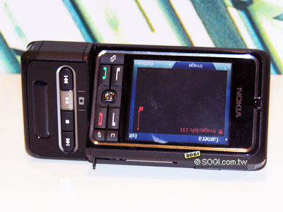 Nokia 3250 的轉軸設計非常有趣,當把傳統鍵盤轉到正面時,它是一款通訊手機,把音樂操作按鍵轉到正面時,它成了一款行動音樂隨身聽,但是把轉軸轉成如上圖中與機身成大約垂直的角度時,它就馬上變成一台數位相機了,真是一款「一機三用」的整合性多功能娛樂手機啊!