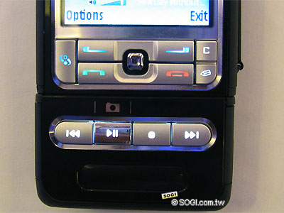 上圖是 Nokia 3250 音樂按鍵的細部圖。使用者旋轉手機底部的音樂按鍵之後,即可開始直接由外型上操作音樂播放,而且還可以進行上下曲目的操作,真是方便…