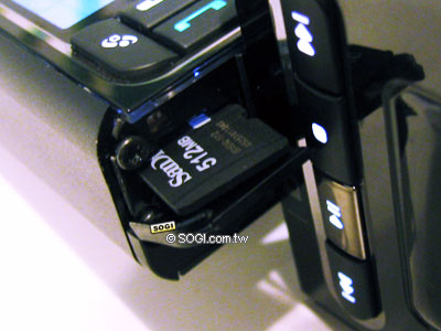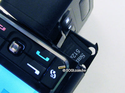 Nokia 3250 支援 micro SD(T-Flash)記憶卡,最大可支援到 1G 的記憶卡容量,而記憶卡插槽的位置則非常特殊,不仔細找還真難發現,Nokia 3250 的記憶卡插槽位於手機的旋轉鍵盤轉軸之間,還真是一個極為特殊與隱密之處啊…