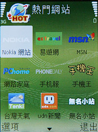 以往,消費者透過 N 系列手機上網,左上圖輸入網址是連接網站唯一的方法,不過在網路加強版手機當中,諾基亞已經預先先幫消費者建立整合幾個常上的熱門網站在手機當中,如無名小站、入口網站網路家庭,在手機網站當中,手機王也非常榮幸地被整合於行動裝置內。除了諾基亞原先整合的幾個熱門網站之外,使用者亦可自行設定更新熱門網站連結點,非常人性化。