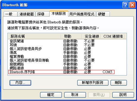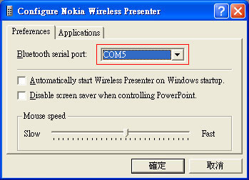首先當然是要有一支 Nokia 6260 及電腦使用的 USB 藍芽接收器,然後手機與電腦都要安裝下載時的軟體,安裝完後先對對看藍芽的設定連接埠是哪一個,並在軟體上也設定相同的才可以對得到!!如下圖: