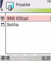 上圖右,為連結後的畫面,此時電腦已開啟 Nokia 6260.ppt 這個檔案,選取後即可進行播放的動作,也可以遙控滑鼠、叫出畫筆等…