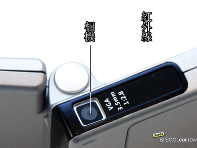 而在音量鍵等的另一邊,就是我們 Nokia 6260 的鏡頭了,還有紅外線埠。內建的是 30 萬 CMOS 感光元件鏡頭模組,並可以進行「無限時間有聲錄影」,不只是系統很 SMART,連錄影也 SMART。