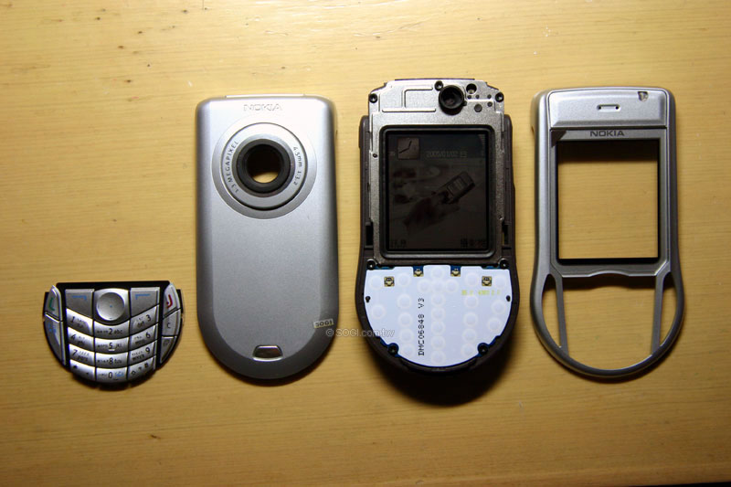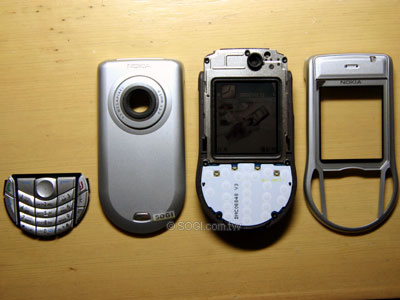 Nokia 6630 除了外型像之前的手機外,可以換外殼也是繼續許多機型的設計,除了有實機的銀色之外,還有紅色、藍色以及米褐色的外型供使用者選擇,但上市之初以銀色為主!!換殼時,先將背蓋取下,再自機頂上的兩邊卡榫往外扳,就可以將前蓋取下以及按鍵,很簡單的頻驟就可以讓你的 Nokia 6630 變成全新的模樣!!