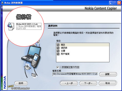 Nokia 6630 可以備份手機內完整的用戶檔案、通訊錄、備註等,即使是重灌一次手機,還可以將這些資料還原到你的手機裡!!