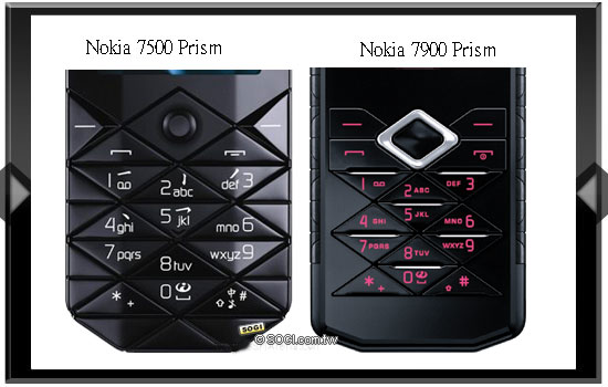 在外觀設計上,Nokia 7900 Prism 與先前發佈的 Nokia 7500 Prism 大同小異,相同的是,這二款手機皆具備獨特多重鑽石狀網格疊加圖騰設計,不同的是,只要仔細觀看這二款手機的外觀,便會發現在按鍵設計的呈現上,差異性還滿大的。如上圖,Nokia 7500 Prism 擁有一個五向導航鍵,而 Nokia 7900 Prism 則是採用一顆 OK 鍵設計,另外,在數字鍵的排列方式上亦呈現不同的排法。