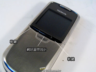 如上圖,在 Nokia 8800 手機螢幕下方分別設計了左右二側的軟鍵,可以不用滑蓋便接聽電話。不過消費者如果要使用到 Nokia 8800 的鍵盤,只要用拇指輕輕把螢幕下方的「網狀圓管」往上推,隨之而來的一聲清脆的「卡嚓」聲之後,Nokia 8800 便快速的秀出隱藏在不銹鋼機身下的鍵盤,如下圖。