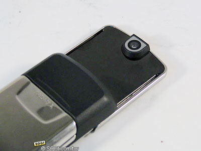 目前市面上很多滑蓋手機的相機鏡頭位置都設計隱藏在滑蓋的下方,Nokia 8800 也是一樣的設計,推開滑蓋,相機鏡頭隱隱從背面出現,這裡比較特殊的是,在鏡頭的周圍有一塊黑色接近透明反光的特殊材質面板,可充當自拍鏡使用。