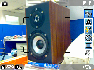光源不足的室內環境下,以自動對焦鎖定超難拍的黑色音箱,一般手機很容易拍出模糊不清,或是出現根本無法對焦的情況。但是,N73「皓雪銀」清楚拍下音箱的原貌,而且二種不同材質的黑色音箱布面也能清楚顯現差異。周圍的藍色辦公室隔版、電話機與雜物,顏色飽和、樣貌清晰。整體表現 OK,可惜光源不足稍暗,使用者可在較暗的室內開啟補光燈,色彩與清晰度的效果會更佳。