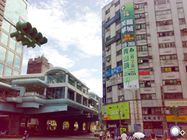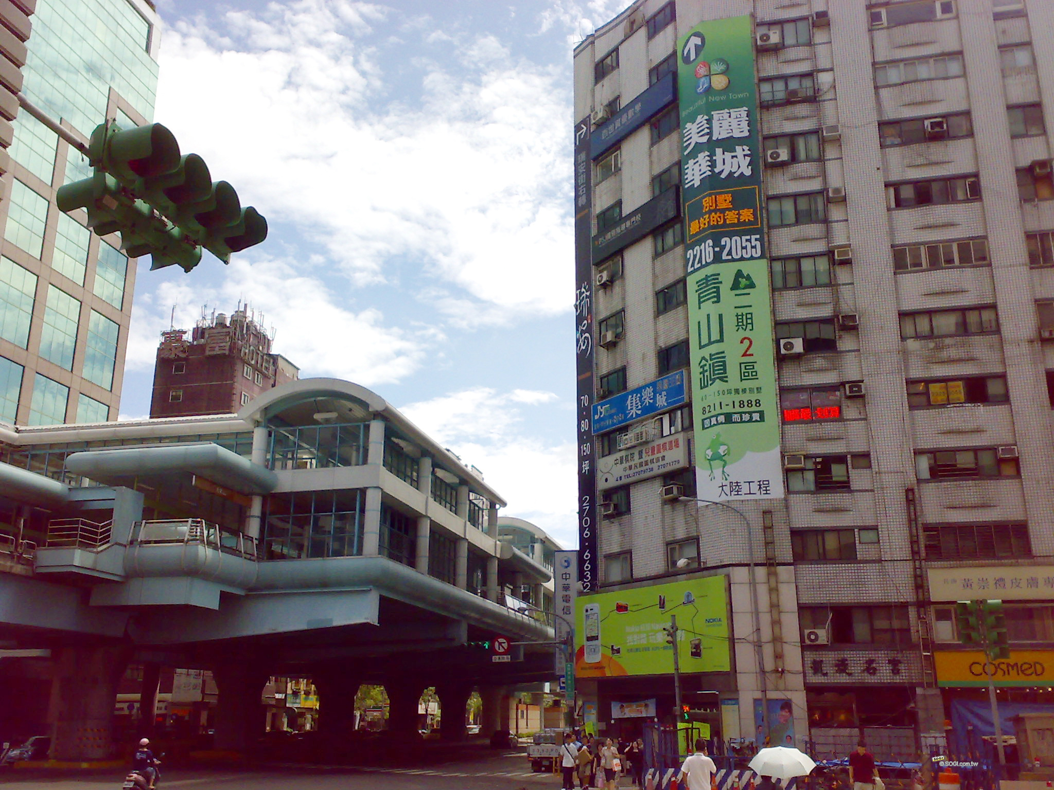 在背光面拍攝十字路口,捷運站下方陰暗處在意料之中效果不佳,但是前方舊大樓斑白的牆面、水漬,與鮮豔的房地產廣告標語,對比強烈的被 N73「皓雪銀」補捉。過馬路的行人與藍天白雲也很清晰。整體而言,即使站在背光面拍照,N73「皓雪銀」也沒問題!