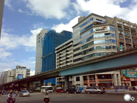 轉個角度同樣的十字路口,換成迎光面拍攝街景。在明亮的陽光輔助下,N73「皓雪銀」將畫面呈現得很有立體感,不但大樓、街道、行人、捷運、車輛都很清晰,顏色表現也相當精準,而且景深的處理也恰到好處,加上栩栩如生的自然天空影像,表現完全不輸專業相機。