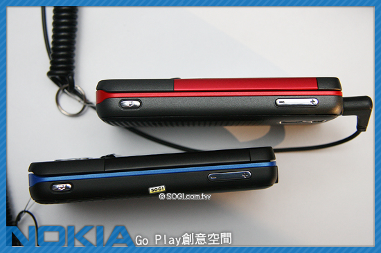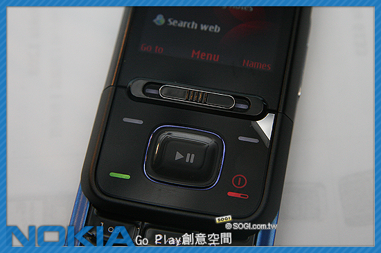 上圖音樂播放鍵上方、2.2 吋 1670 萬色 QVGA 彩色螢幕下方的橫條按鍵即是上一段所提到的「滑梭式音樂軸」設計,該設計非常特殊,可左右滑動,滑動時,螢幕亦將隨之更換。